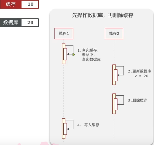 数据库值一开始为10,线程2查到的是10,随后写入缓存,线程1再进行更新操作,数据库中值改为20,这时就会出现缓存不一致的情况